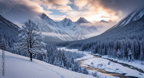 Majestic snowy peaks dominate a pristine winter landscape with a winding river and frosted trees basking in the dawn's