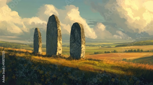 Majestic standing stones on a hill, set against a realistic background of rolling fields and peaceful skies