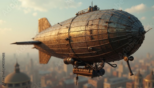 Majestic steampunk airship gliding over historic city skyline at sunset, adventure and wonders