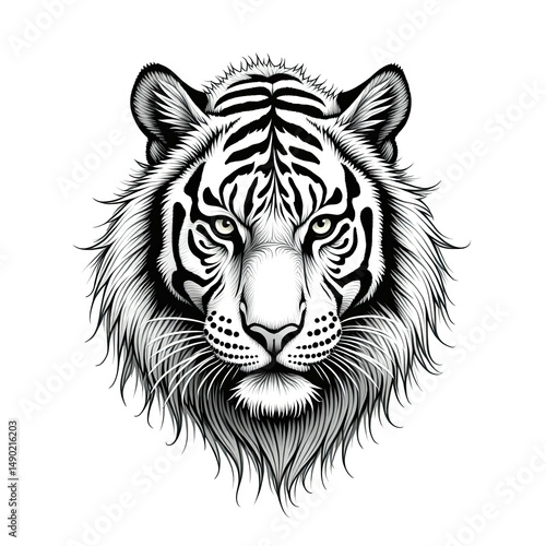 tiger, portrait, face, head, animal, wild, wildlife, big cat, felino, drawing, illustration, line art, black-and-white, monochrome, artistic, detailed, intricate, hand-drawn, vignetting, graphic, design, art, artwork, digital artwork, wild animal, predator, powerful, majestic, fierce, nature, safari, zoo, asia, jungle, stylised, isolated, white background, vector, print, emblem