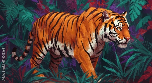 tiger, jungle, animal, painting, digital artwork, wildlife, nature, orange, black, white, green, vibrant, colourful, tropical, forest, artistic, illustration, abstract, wild, predator, stripes, mammal, fauna, exotic, closeup, stylised, high-coloured, impressionistic, leaf, flora, artwork, design, wildcat, big cat, graphic design, creative
