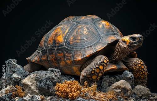 Majestic Tortoise Resting on Rocky Surface Surrounded by Lush Coral, Showcasing Beautiful Textures and Vibrant Colors in Studio Lighting
