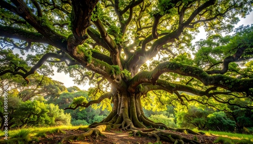 tree, canopy, branch, leaf, green, nature, sunlight, root, forest, ground, lush, vibrant, foliage, sprawling, majestic, ancient, strong, landscape, environment, growth, beauty, life, earth, sunlit, peace, harmony, wide, spreading, powerful, organic, alive, exuberant, flourishing, healthy, natural, scenic, freedom, brilliancy, evergreen, botanical, ecological
