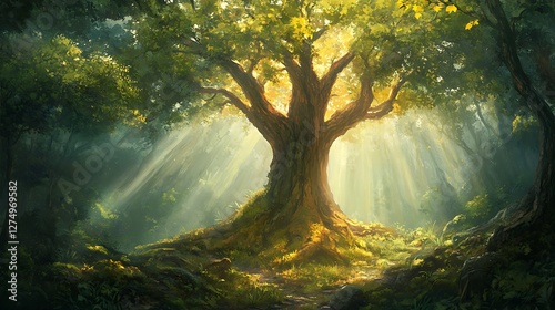Majestic Tree with Sunlight Streaming Through Forest Canopy Illustration