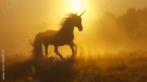unicorn, silhouette, majestic, magical, fantasy, horse, mythical, creature, rearing, sunset, haze, golden hour, mystery, enchanting, aethereal, dreamlike, nature, forest, meadow, mystical, galloping, beauty, surreal, wonder, fairy tale, magic, whimsical, landscape, isolated, serene, calmness, horizon, backlit, golden light, shadow
