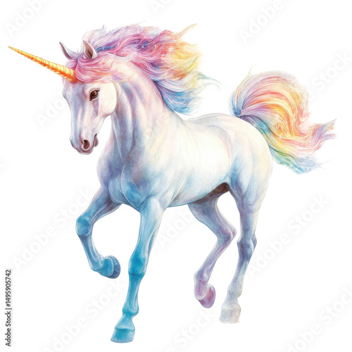 Majestic Unicorn with Colorful Mane in a Dreamlike Setting on transparent background