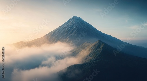 mountain, volcano, peak, sunrise, cloud, misty, landscape, scenic, nature, elevated, view, huge, summit, green, dark, light, foggy, calm, tranquil, beautiful, dramatic, majestic, epic, sunset, horizon, sky, atmosphere, elevation, cloudscape, volcanic, serene, peaceful, adventure, travel, exploration, wild, inspiring, awe, wonder, immensity, calmness
