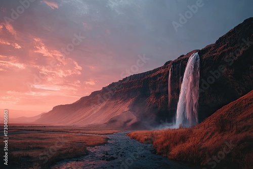 waterfall, sunset, cliff, iceland, nature, landscape, dramatic, water, mountain, red, cloud, sky, mist, stream, gold, colours, dusk, travel, scenic, beauty, adventure, tour tourism, photo, epic, huge, rocky, flowing, canyon, desert, golden hour, cloudscape, misty, hike, explore, serenity, icelandic, vacation, stunning, beautiful, inspiring, marvellously