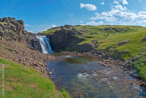Majestic waterfall lush green hills panoramic landscape vibrant blue sky
