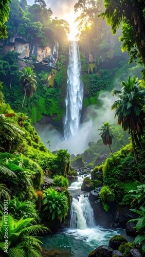 waterfall, nature, landscape, greenery, forest, tropical, sunlight, mist, mountain, river, rock, foliage, paradise, scenic, beauty, calmness, flora, adventure, exploration, travel, freshness, vibrant, ecosystem, natural, wildlife, serenity, scenic view, hill, water, canyon, natural beauty, summer, lush, environment, sunshine, meditation, peaceful, sky, remote, untouched, tropical paradise