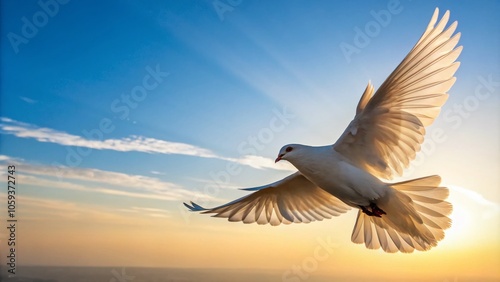 Majestic White Dove in Flight Against a Clear Blue Sky with Golden Sunlight for Peace and Freedom Imagery