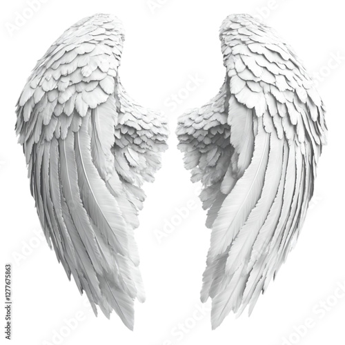 wing, white, feather, angel, angelic, heavenly, divine, grace, flight, aethereal, soft, serene, peace, purity, spirituality, religious, faith, hope, belief, freedom, power, symbolism, artwork, three-dimensional, rendering, model, texture, light, shadow, background, white background, monochrome, greyscale, delicate, elegant, majestic, powerful