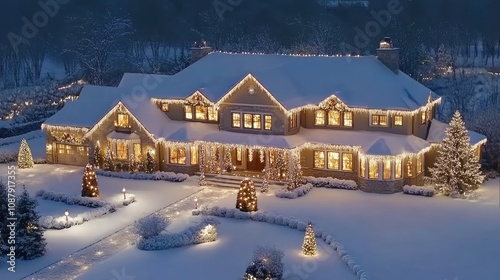Majestic Winter Wonderland Home Decorated with Twinkling Lights Enveloped in Snow Under a Clear Night Sky Perfect for Holiday Spirit and Festive Celebrations