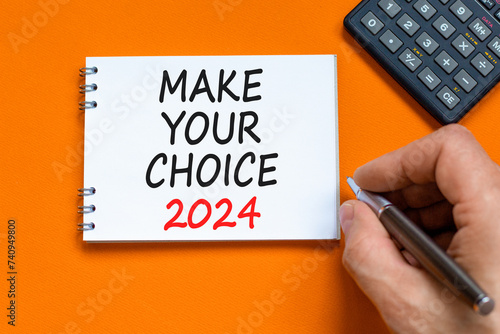 Make your choice 2024 symbol. Concept words Make your choice 2024 on beautiful white note. Beautiful orange background. Voter hand. Calculator. Business Make your choice 2024 concept. Copy space