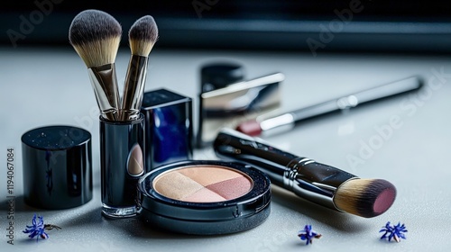 Makeup application essentials flat lay home studio photography display light and shadow beauty concept