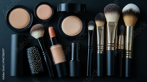 make-up, cosmetic, brush, beauty, powder, lipstick, foundation, palette, tool, black, background, professional, constructed, up, product, kit, flat, lay, photo, top, view, arrangement, still, life, dark, elegant, stylish, glamourous, luxury, premium, high, end, artist, fashion, style, aesthetic
