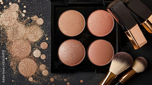 beauty, cosmetic, make-up, eyeshadow, palette, powder, reddening, shimmer, glistering, sparkle, brush, applicator, application, tool, lip, lipstick, tube, gold, black, design, glamour, style, fashion, elegant, product, shiny, highlight, colours, texture, composition, surface, background, detail, view, studio, closeup, luxury, accessory, essential, collection, artistry, bronze, neutral, face, soft, round, compact