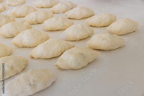 Making homemade buns from yeast dough on white countertop, using potatoes as filling