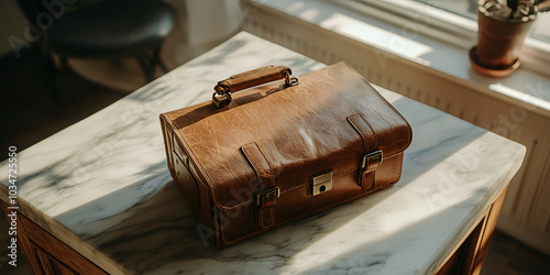 Mala estilosa sobre uma superfície de mármore