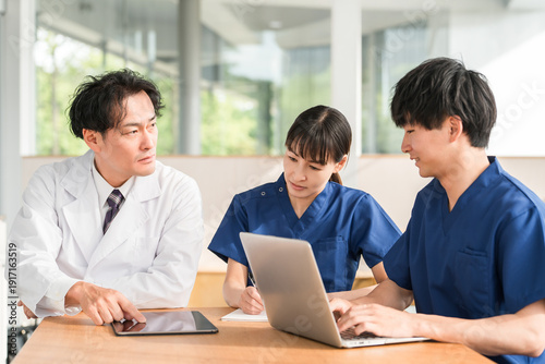 doctor, instruction, medical office, conversation, conference, tablet, meeting, smile, nurse, teacher, medicals, health care, hospital, white coat, clinic, welfare, scrub, team, man, intern, physician, consultation, treatment, health, explanation, woman, care, physical therapist, training, middle-aged, three people, japanese, asian, chinese, people, indoor