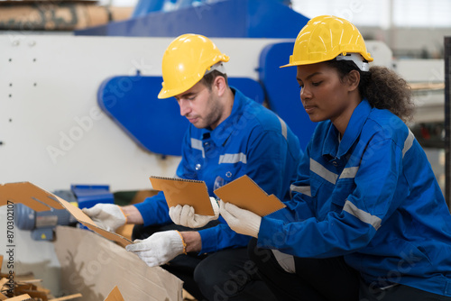 Male and female factory worker checking inventory of cardboard in corrugated carton boxes warehouse storage. Group of factory worker checking stock of cardboard corrugated carton boxes in factory