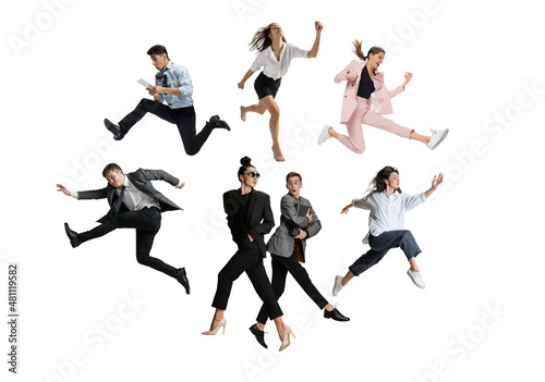 Male and female office workers jumping and dancing in casual and business style clothes with folders, coffee, tablet on white background. Ballet dancers. Set