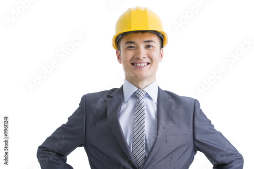 chinese, architect, hard hat, confidence, pride, engineer, safety, protection, designer, engineering, industry, construction, helmet, people, one person, male, man, young men, one man only, asian ethnicity, young adult, adult, adults only, businessman, businessperson, office worker, occupation, professional occupation, expertise, business, achievement, aspiration, cheerful, enjoyment, happiness, joy, success, vitality, modern, lifestyle, independence, responsibility, smiling, standing, toothy smile, china, east asia, asia, beijing, photo, color image, copy space, front view, portrait, studio shot, waist up, cut-out, white background, full suit, suit, attaching, well-dressed, horizontal