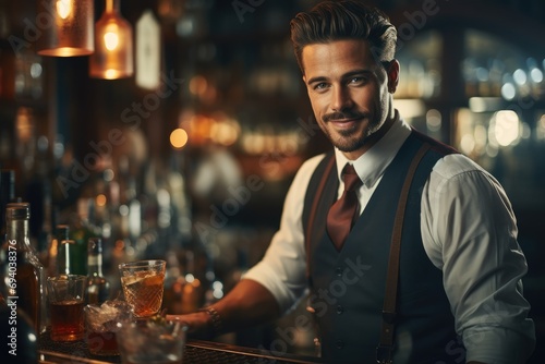 Male bartender making cocktail in bar. Generative AI.
