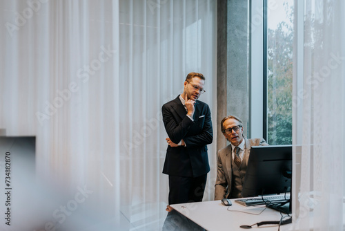 business, businessman, business meeting, businessperson, working, day, computer, computer monitor, discussion, entrepreneur, europa, finance, photo, front view, color image, corporate culture, goteborg, waist up, horizontal, indoor, colleague, communication, office, mature adult, meeting, planning, selective focus, sitting, scandinavia, desk, standing, sweden, teamwork, technology, two people, young men, young adult, connection, occupation, professional occupation