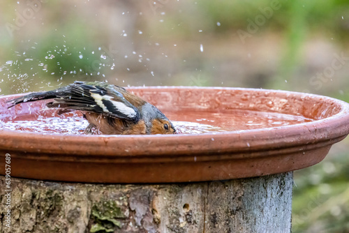 Male chaffinch having a bath in a dish of water
