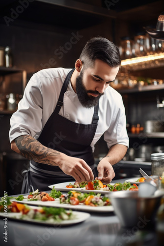 Male chef in the kitchen artfully and beautifully preparing gourmet dishes. Chef is preparing food in the kitchen. Close-up of chef decorating dishes