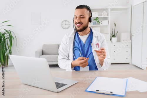 Male dentist with headset and tooth model giving online consultation at table in clinic