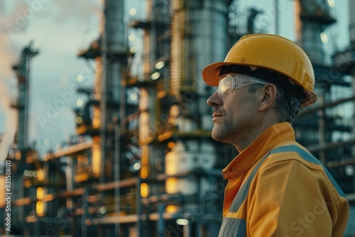 Male engineer in safety gear observes an oil refinery at dusk with a contemplative expression