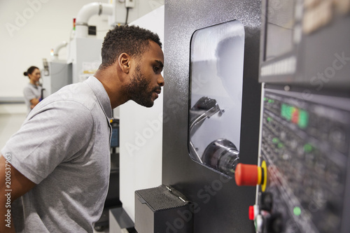 Male Engineer Watching Progress Of CNC Machinery In Factory