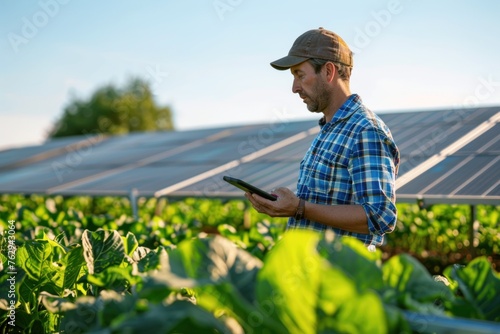 Male farmer in a plaid shirt standing in a lush green field of cabbages, using a tablet to monitor the growth of his crops. In the background, solar panels soak up the suns rays.