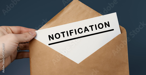 Male hand holding craft envelope with text NOTIFICATION on blue background
