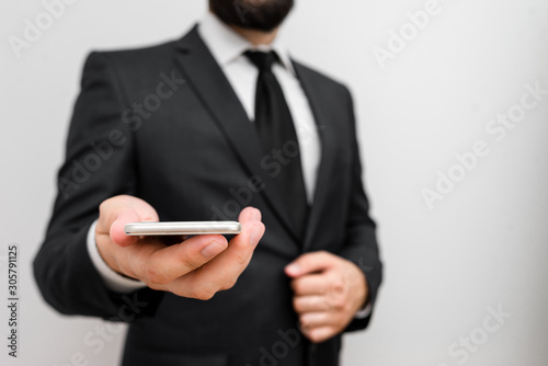 Male human wear formal work suit hold smart hi tech smartphone use one hand