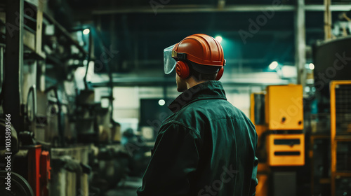 male industrial worker wearing protective gear stands in noisy factory, surrounded by machinery and equipment. dim lighting and industrial setting create focused atmosphere