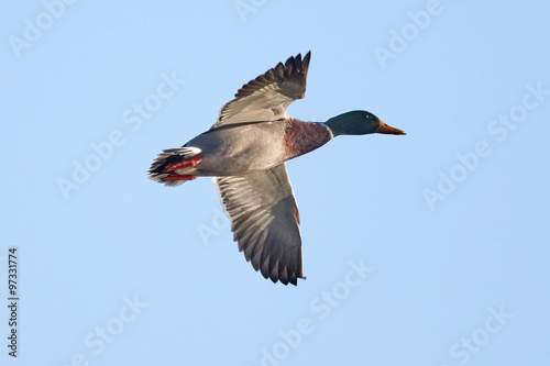 Male Mallard Duck in Flight Against Blue Sky