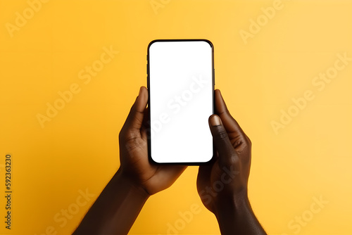 Male or Female hands holding smartphone with blank white screen isolated on yellow background. Black man using device. Copy space. Mockup or Template for Presentation. Generative Ai.