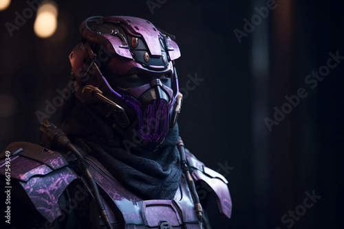 Male samurai hero character in futuristic crafted armor in purple generative ai