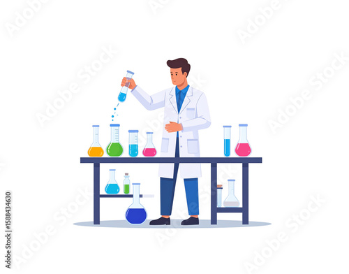 scientist, chemist, researcher, man, male, professional, expert, biologist, technician, working, experimenting, researching, analysing, pouring, mixing, creating, developing, discovering, testing, holding, laboratory, glassware, flask, beaker, tube, liquid, chemical, substance, solution, formula, reaction, experiment, science, chemistry, biology, pharmacy, research, development, discovery, innovation, technology, illustration, vector, flat, cartoon, design, colourful, isolated, blue