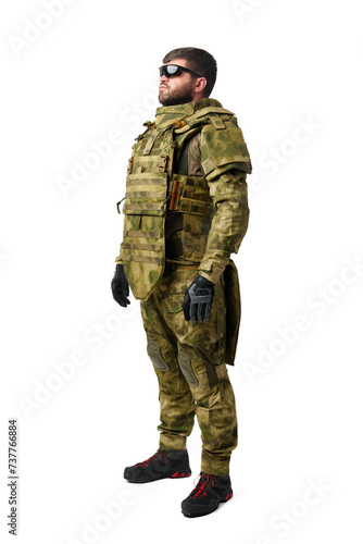 Male soldier in military ammunition isolated on white background