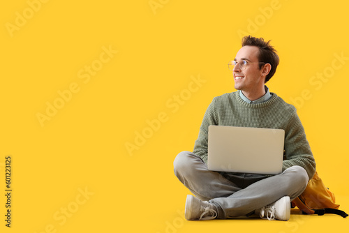 laptop, male, student, yellow, adult, background, backpack, casual attire, caucasian, class, clothes, college, colours, computer, education, exam, guy, cyberspace, cognition, learn, learning, lesson, lifestyle, man, modern, online, people, person, portrait, programming, school, sitting, study, studying, subject, surfing, task, test, university, young, youth