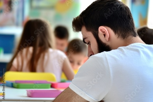 teacher, student, classroom, school, children, education, learning, mentor, teaching, academic, children, young, primary, male, activity, study, colourful, back, interior, together, group, interaction, teaches, class, cognition, grow, sharpened, attentive, development, desk, educational, educator, instruction, teamwork, lesson, support, care