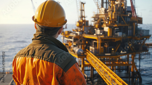 male worker against the backdrop of an oil production offshore platform, view from the back
