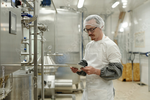 Male worker in sanitary lab examining industrial machinery while holding tablet, surrounded by stainless steel equipment and pipes. Worker wearing protective gear and hairnet