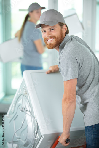 man, carry, washing, machine, people, 2, overall, washer, repair, repairman, holding, male, beautiful, equipment, using, home, hand, room, casual attire, job, problem, woman, work, client, vehicle, female, improvement, checking, handcart, expertise, cart, service, handyman, worktop, appliance, house, fix, men at work, technician, kitchen