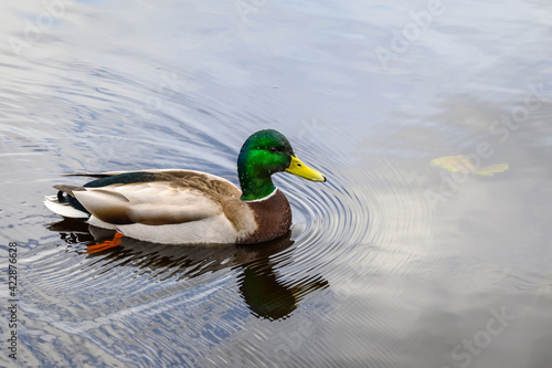 Mallard duck swimming on a peaceful lake with reflection of blue sky and white clouds
