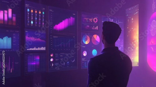 Man Analyzing Colorful Data Visualizations on Digital Panels in Dark Space